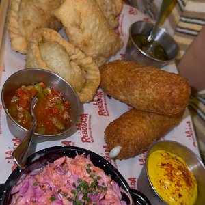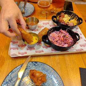 Todo lo que comimos, estaba demasiado bueno, pedimos dedos de mozarela, pollo rebozado, ensalada coleslaw, macan cheese de entrada y pinsa y hamburguesa, de segundo, un lugar muy cómodo y una muy buena atención.
